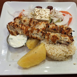 For those looking to share a meal, the Pikilia Platter is a must-try, featuring a combination of Spanakopita, Dolmades, Tzatziki, Kopanisti, Taramosalata, Cucumbers, Tomatoes, Pita Bread, Olives, and feta. This platter is perfect for sampling a variety of Greek delights.